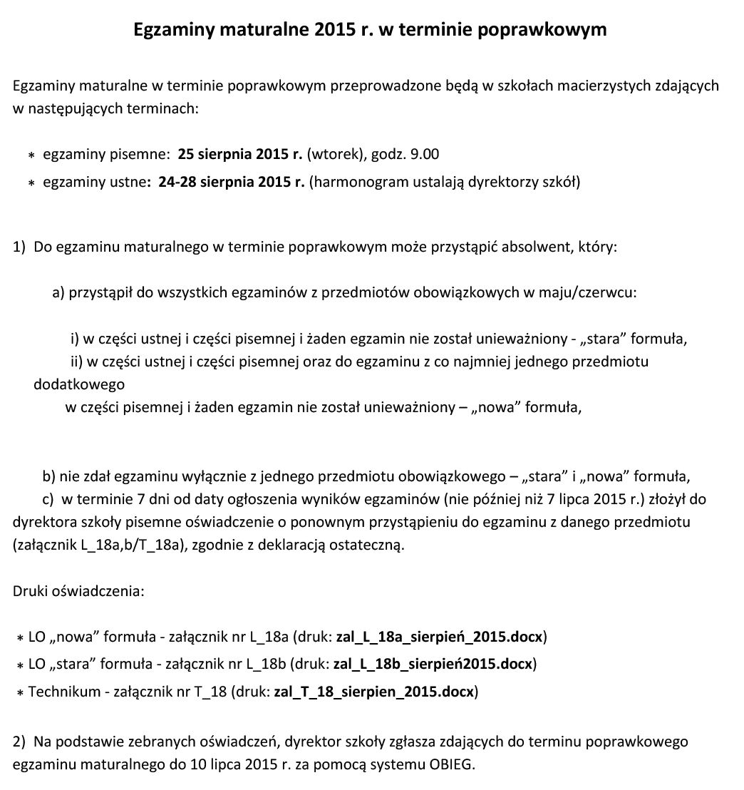 PRZYPOMINAMY EGZAMIN MATURALNY POPRAWKOWY SIERPIEŃ 2015 odbędzie się: